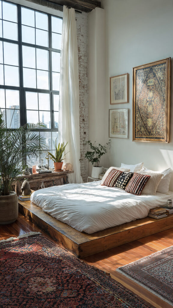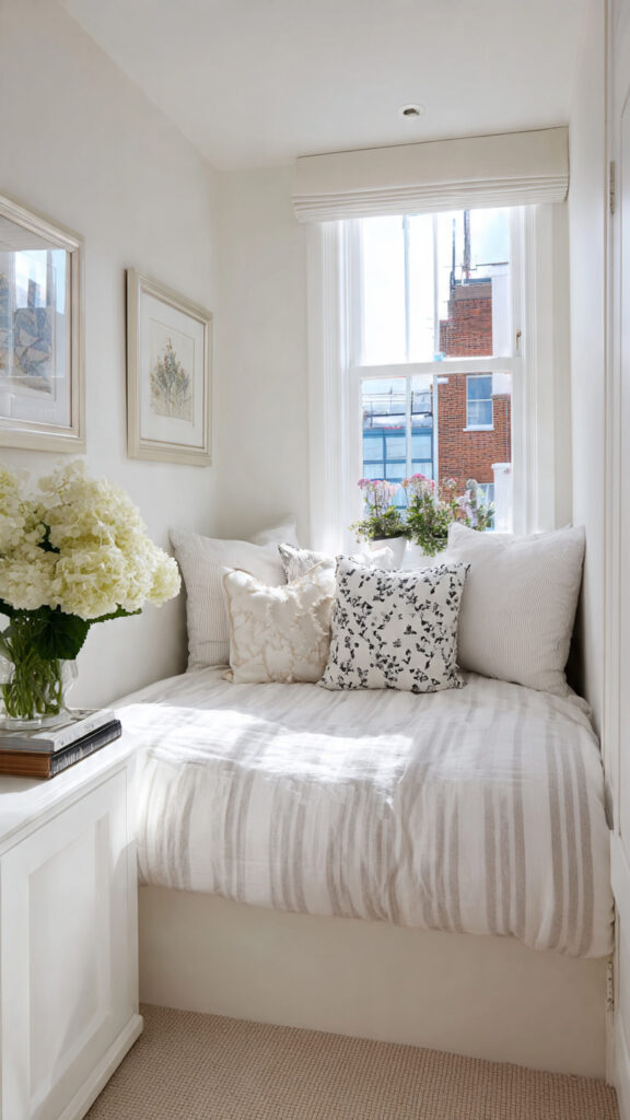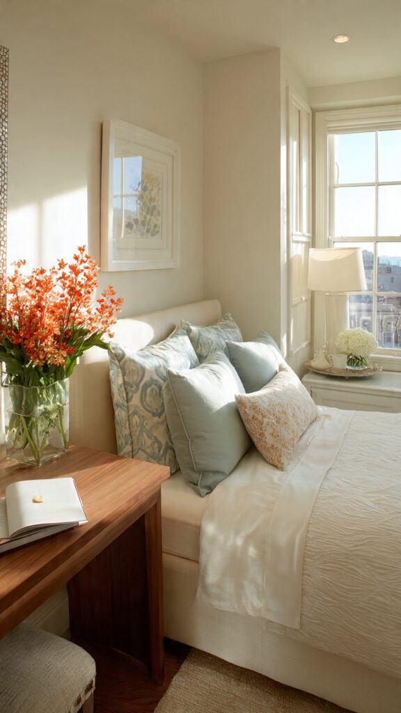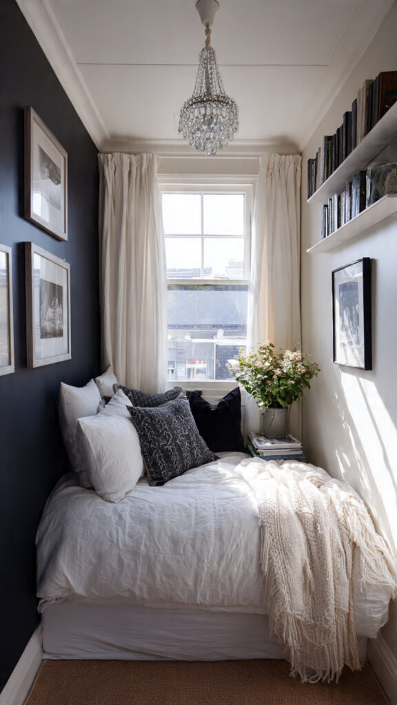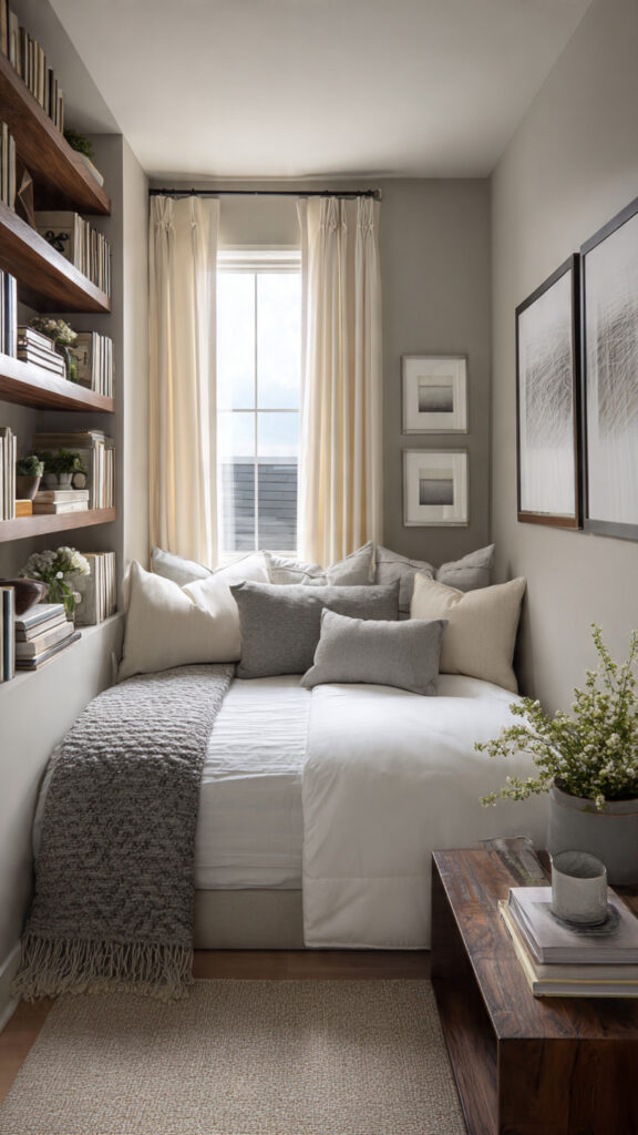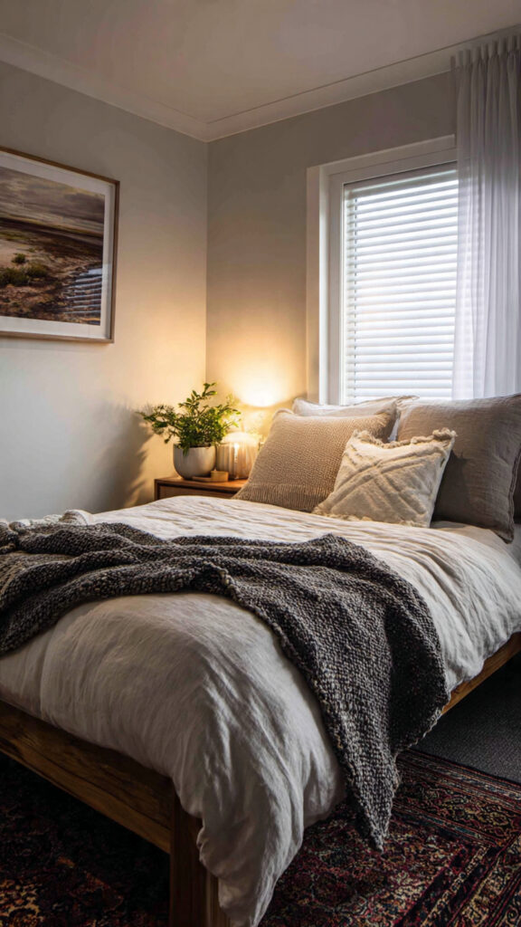 Light, neutral colors help reflect available daylight. Avoid heavy bed frames or oversized headboards that crowd the space visually. Soft textures in bedding add warmth without adding bulk. Instead of filling the walls with multiple art pieces, choose one meaningful item that anchors the room.