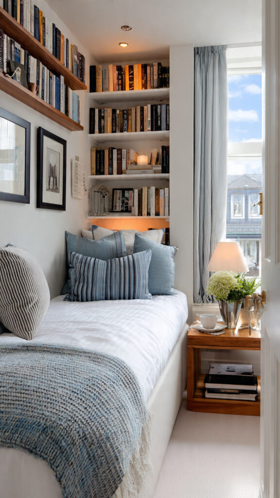 Wide furniture pieces can quickly consume valuable floor space. Vertical storage shifts attention upward and keeps the lower portion of the room open. This is one of the most practical Small Spare Bedroom Ideas for making a tight room feel taller.