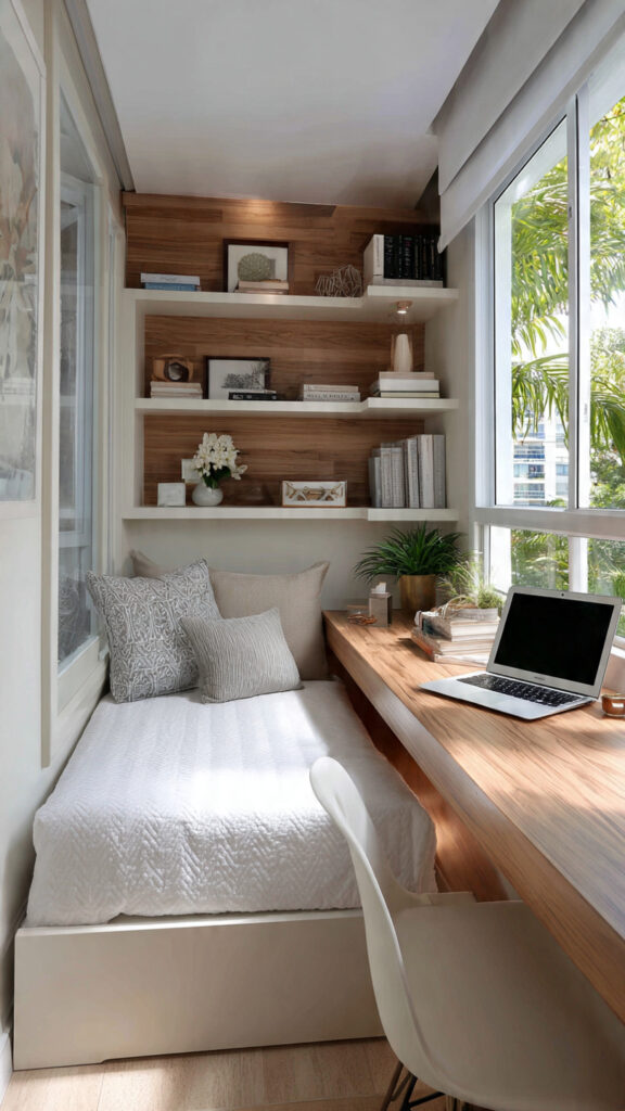 Choose a narrow or wall-mounted desk. Place it near natural light if possible. Select a lightweight chair that can tuck completely underneath. Keep cords hidden to maintain a clean look.
