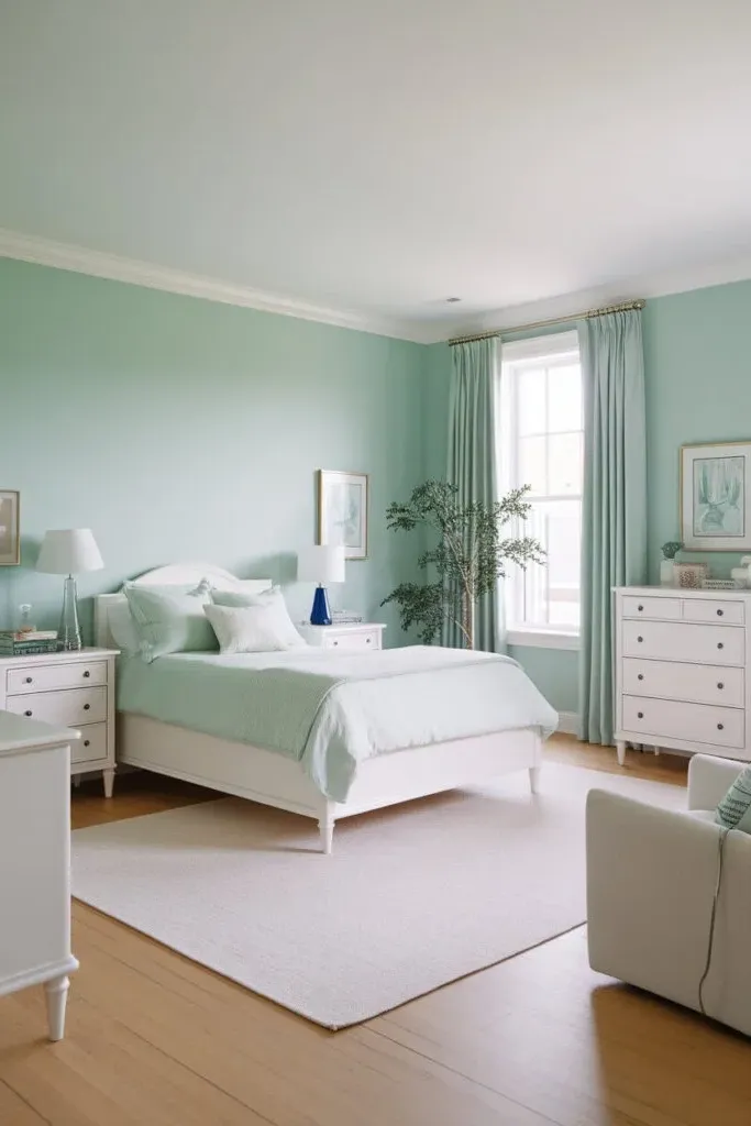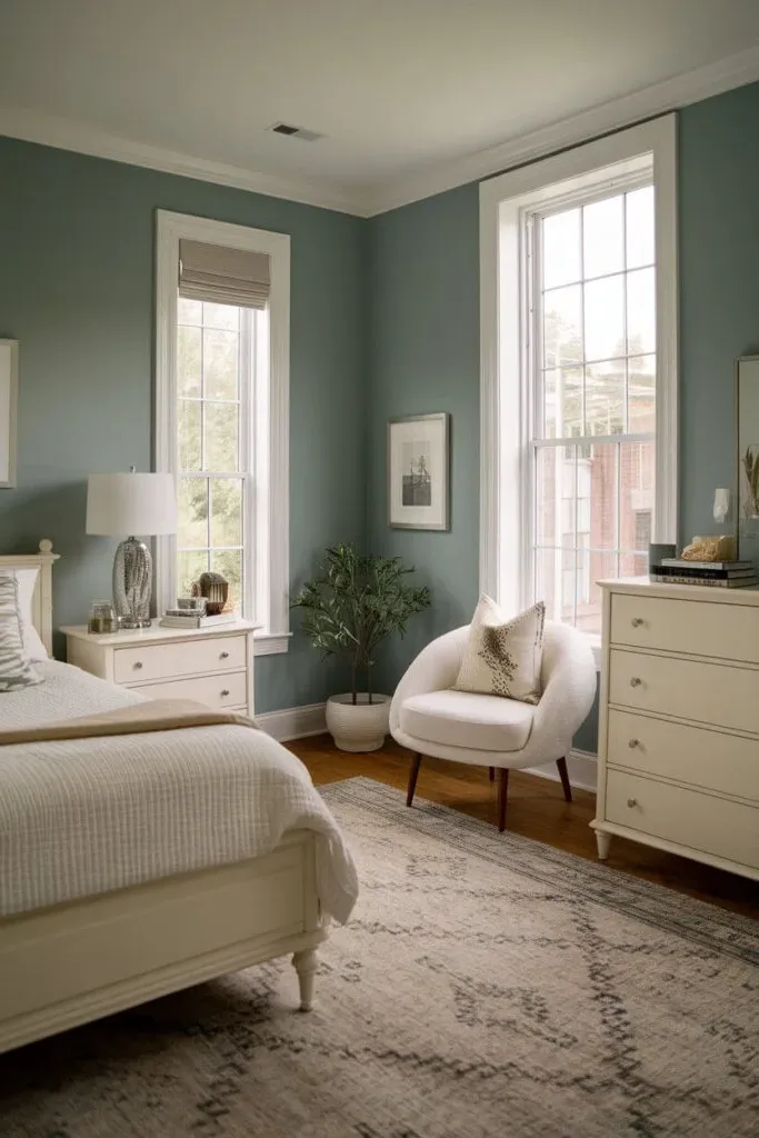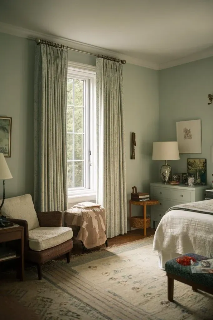Pale sage blue combines soft blue with muted green, creating a cool, peaceful atmosphere ideal for a restful bedroom.