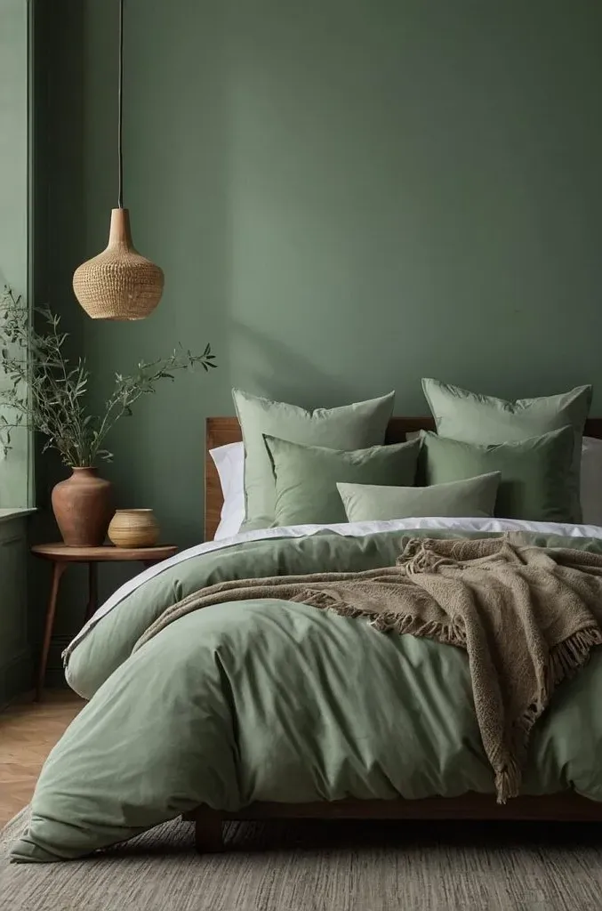 Sage green brings the tranquility of nature indoors. This muted green creates a gentle, grounding atmosphere perfect for bedrooms. Paired with light wood furniture or natural accents, sage green helps your space feel fresh, relaxing, and effortlessly balanced.