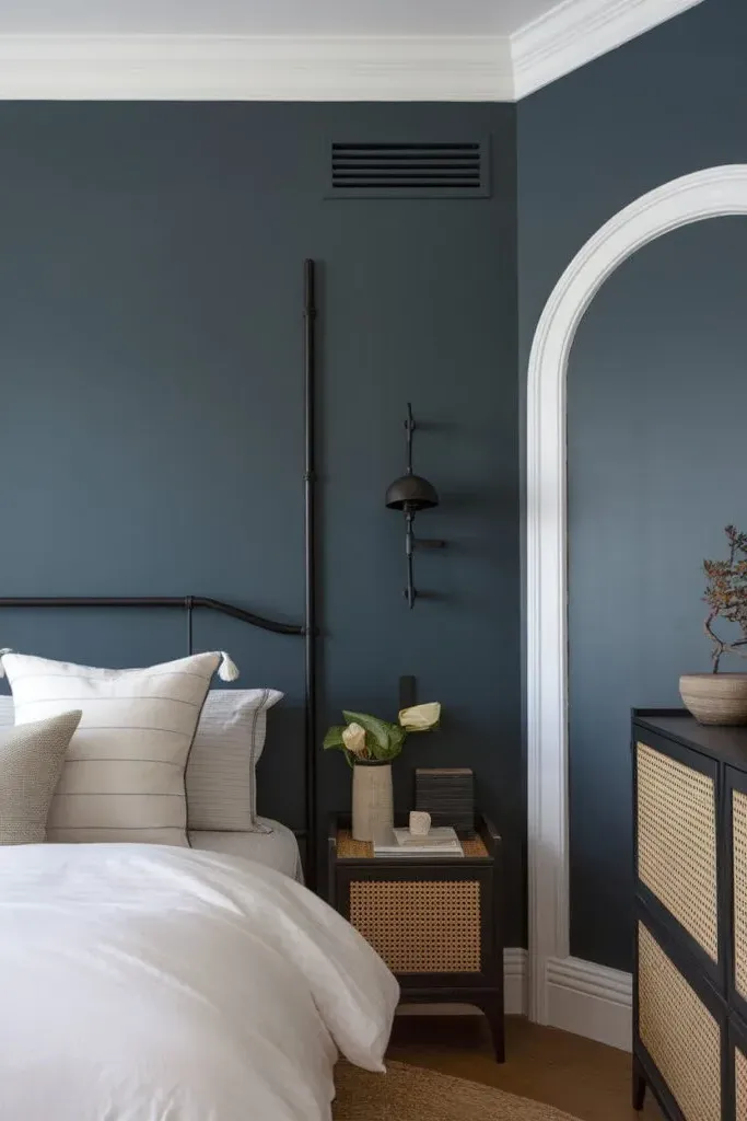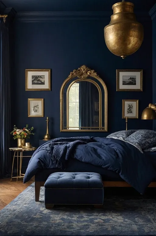 Deep navy makes a bold statement without being overpowering. It’s rich and dramatic, especially as an accent wall. Adding metallic touches or gold décor creates a luxurious yet comfortable atmosphere. Navy can give your bedroom depth and personality, making it feel stylish and warm at the same time.