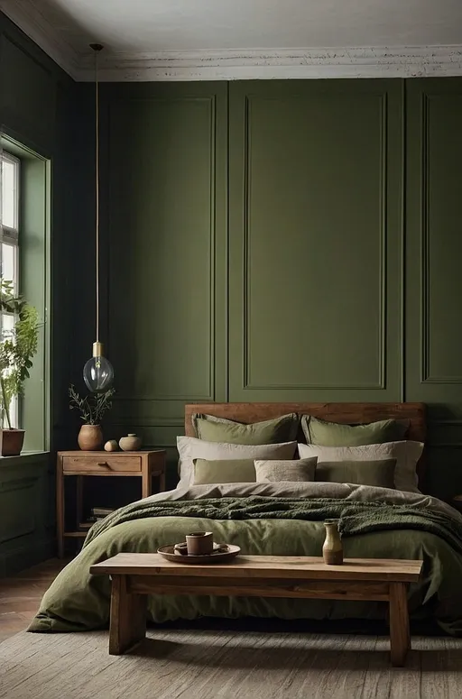 Olive green is warm, earthy, and grounding. It’s perfect for creating a bedroom that feels connected to nature. When paired with wood, stone, or natural textiles, olive green gives your space a cozy, tranquil, and welcoming vibe.