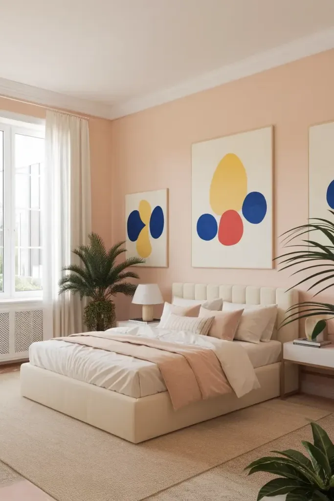 Pale apricot adds gentle warmth and sunshine to a bedroom. This soft peachy shade uplifts without being overwhelming, perfect for brightening the space naturally.