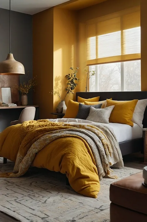 Mustard yellow is cozy, cheerful, and welcoming. It adds personality and a sunny touch without feeling too bold, making the bedroom feel warm and sophisticated.