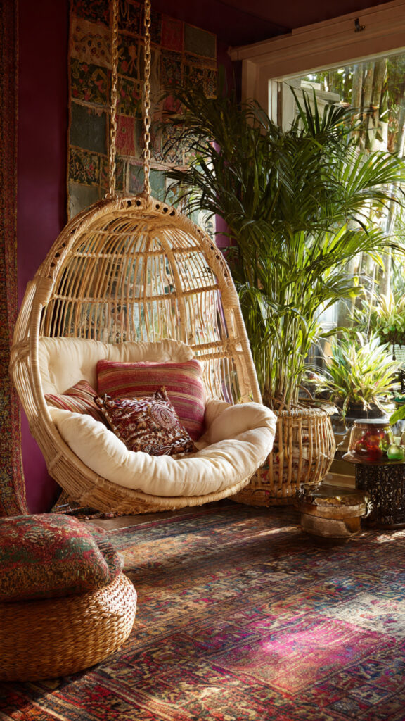 Boho chic style uses a mix of earthy tones and bold accents. I usually see shades like beige, brown, green, and deep red combined in one space.