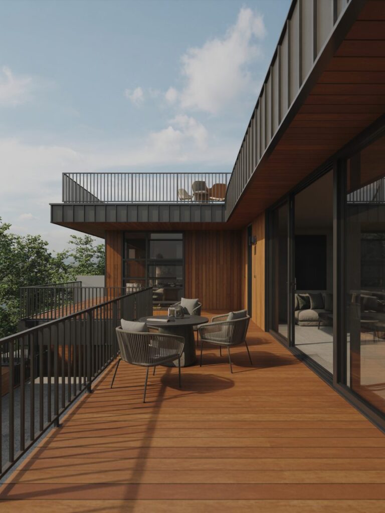 Pairing black metal with warm wood decking creates balance. This contrast is widely used in modern homes because it feels both sharp and inviting.