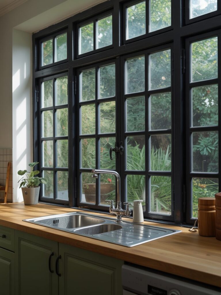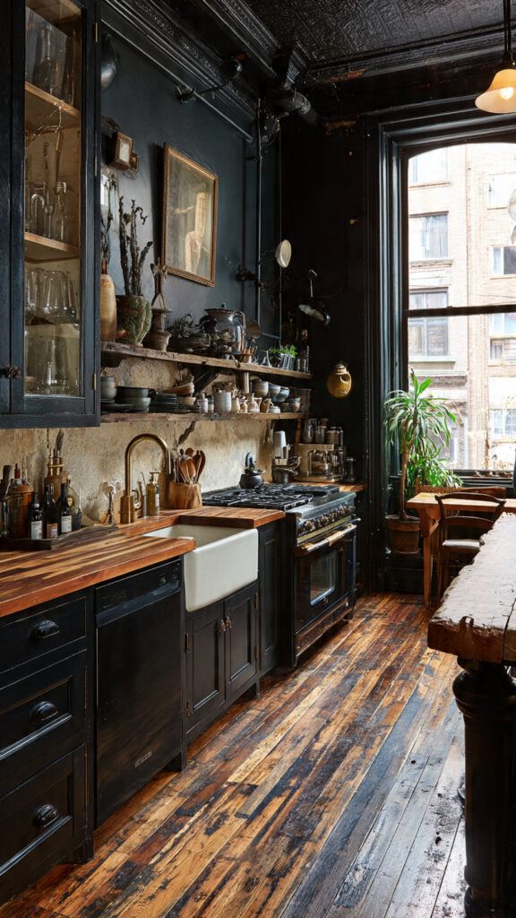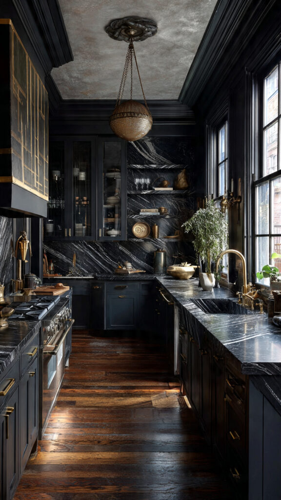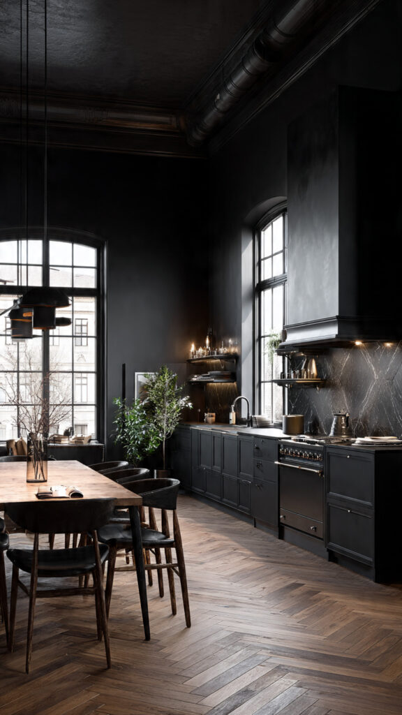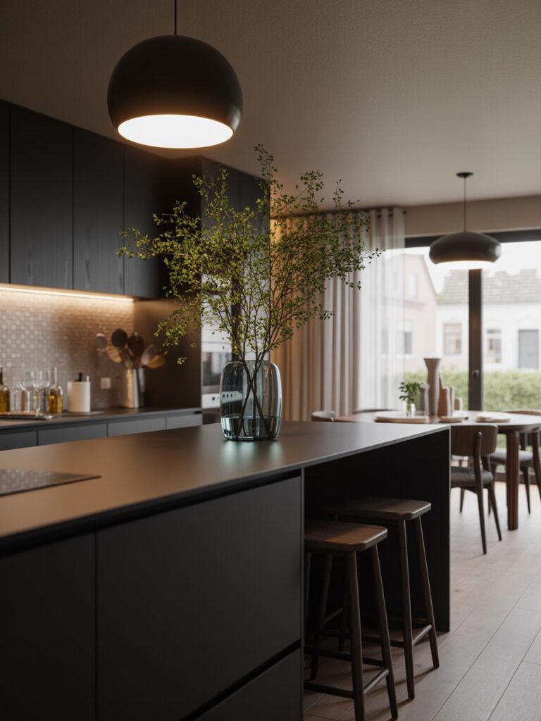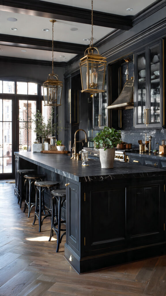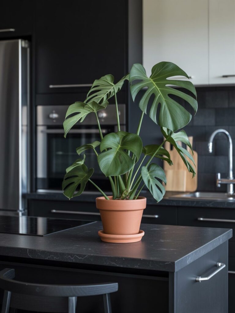 I always add plants to dark kitchens. Green plants stand out against black and make the space feel fresh. Studies show indoor plants can improve mood and reduce stress.