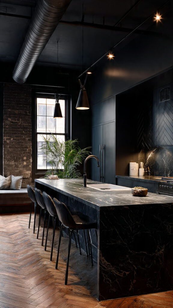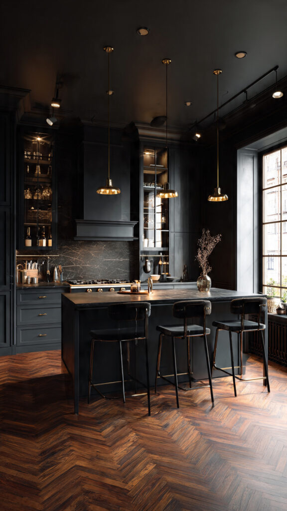 Dark kitchens naturally feel more intimate. Adding seating or a bar area turns the kitchen into a place where people gather, not just cook.