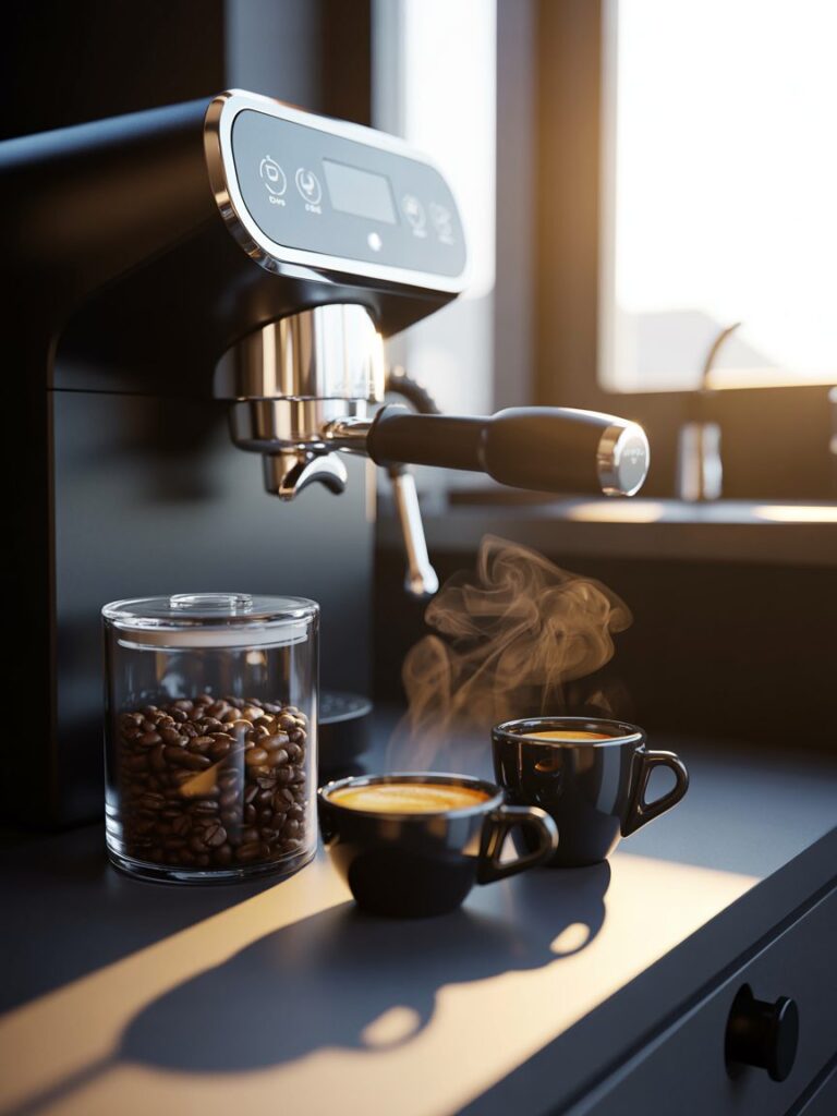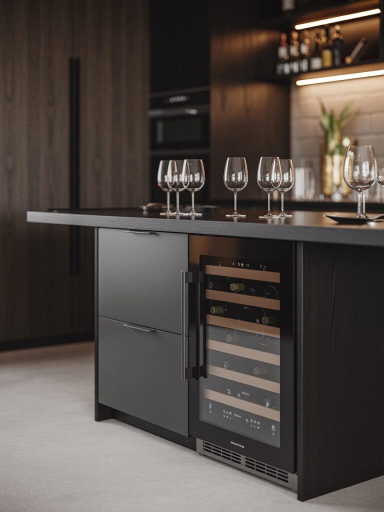 A built-in coffee station is one upgrade I always suggest. It keeps the counter organized and adds a luxury feel. Even a simple black coffee machine can make the space look more cohesive.