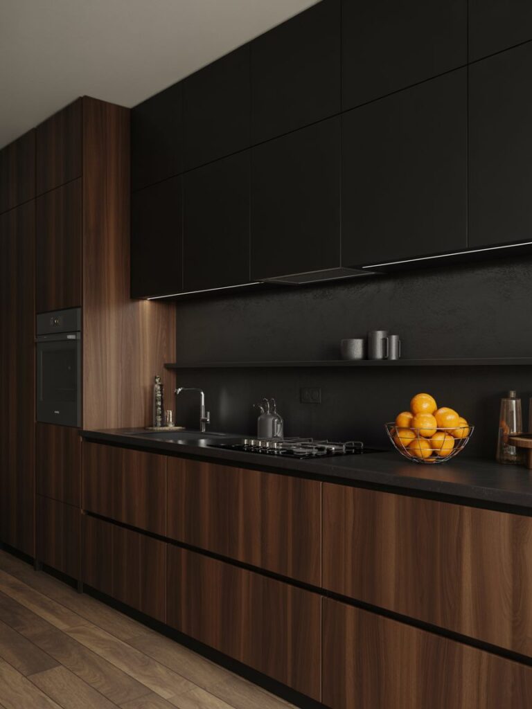 I often recommend mixing black cabinets with brown wood tones. It creates depth and makes the space feel layered. Lower cabinets in wood and upper ones in black is a layout I’ve seen work consistently well.