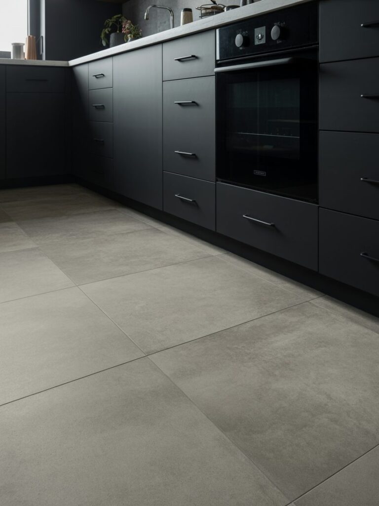 I prefer grey floors with black cabinets because they create contrast without being too sharp. Concrete-style tiles are popular right now and also very durable for daily use.