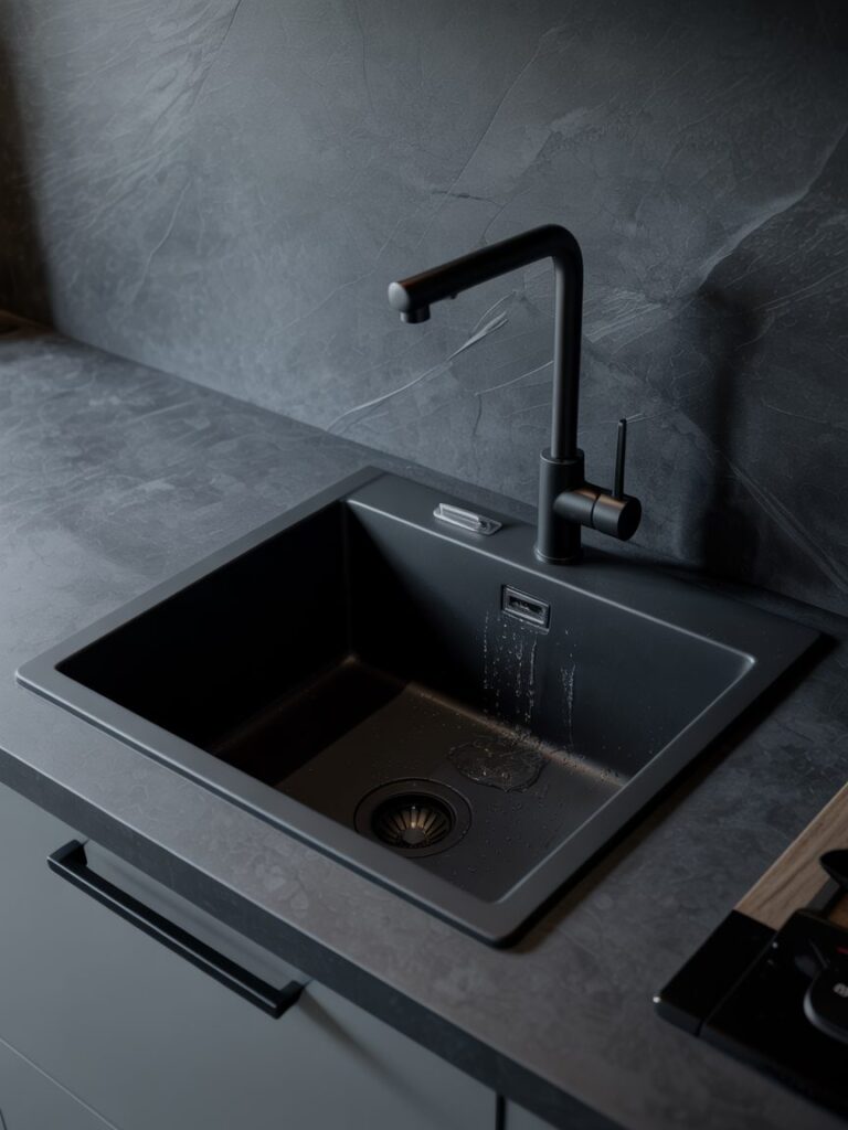 I like pairing a black sink with a matching backsplash and faucet. It creates a seamless look where everything blends together. This works especially well in minimalist kitchens.
