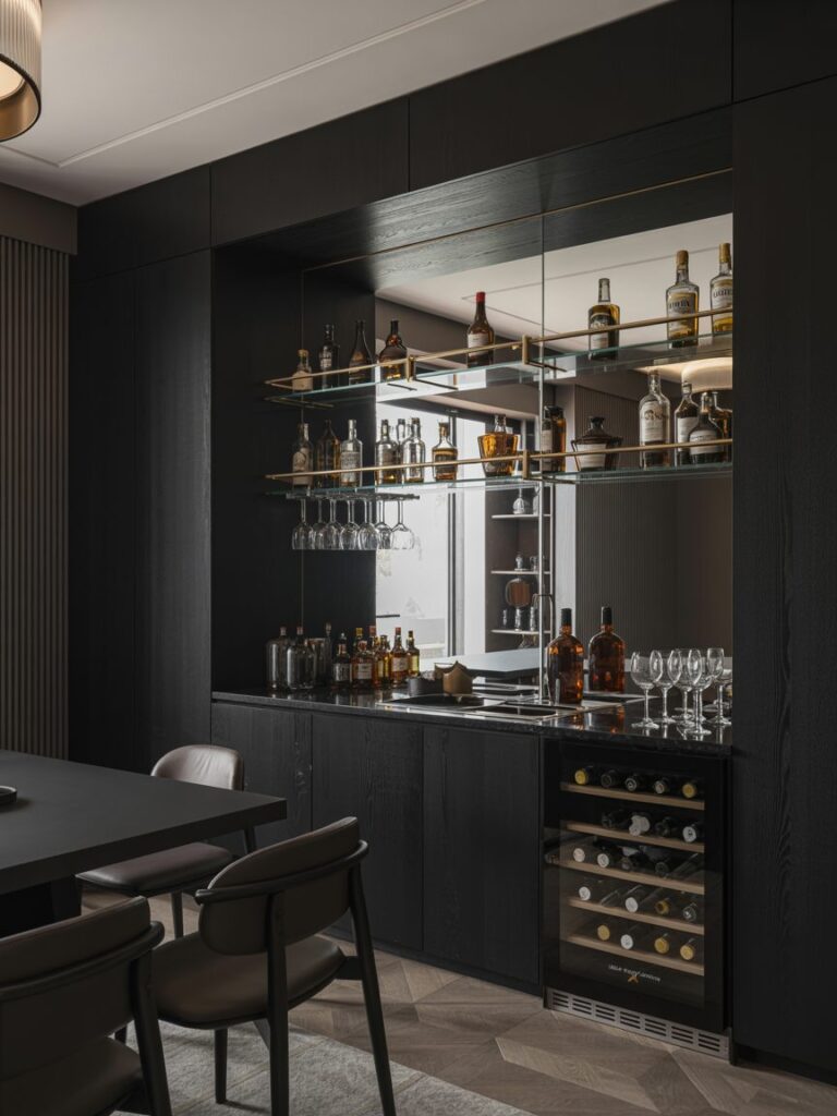 A small bar setup can add a luxury feel. I usually include glass cabinets or reflective surfaces to keep it visually balanced.