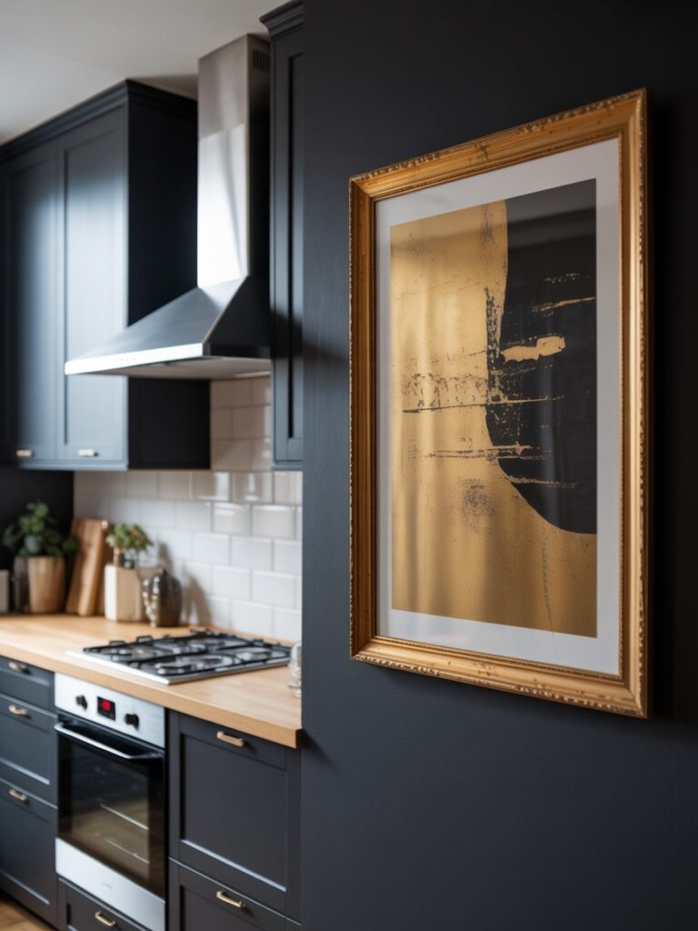 I never leave walls empty. Adding simple artwork or frames helps break the dark tone and adds personality without cluttering the space.