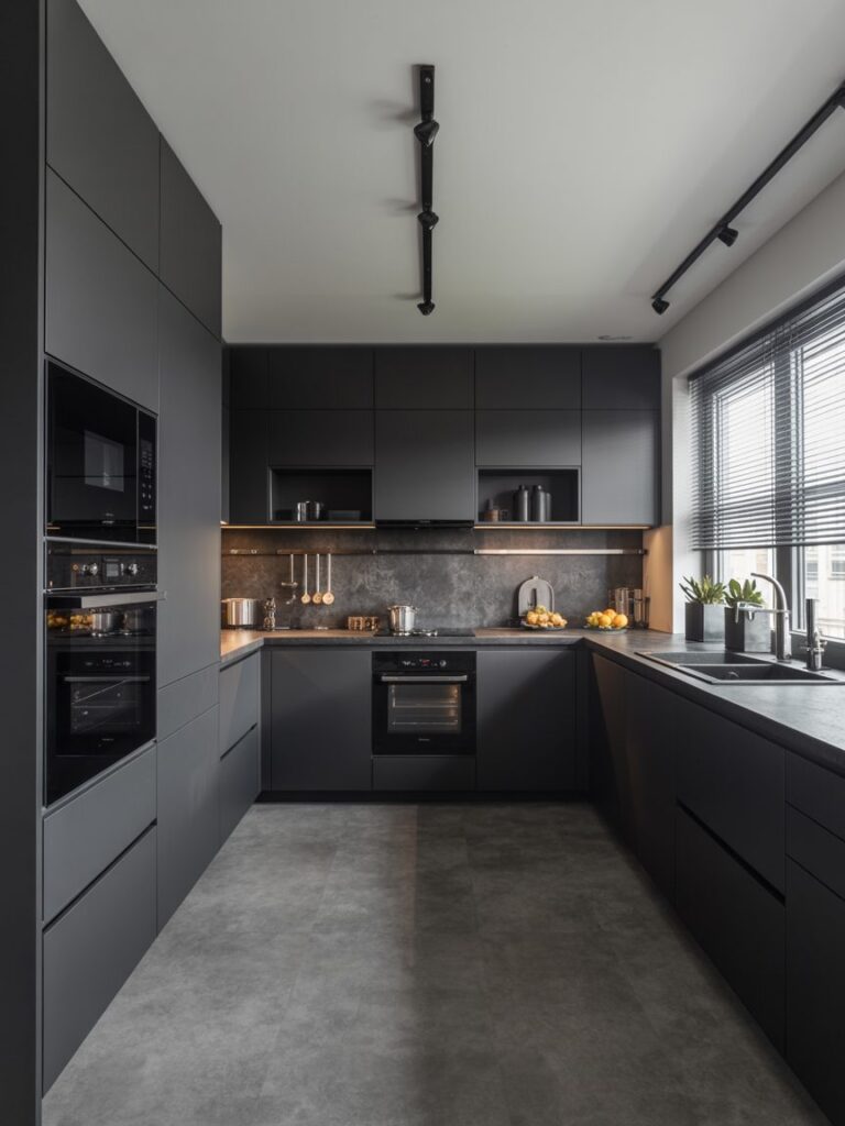 I’ve used black-on-black setups before, and when done right, they look seamless. The key is texture. Materials like quartz or granite add natural variation, which prevents the kitchen from looking flat. This approach works best in larger spaces with good lighting.
