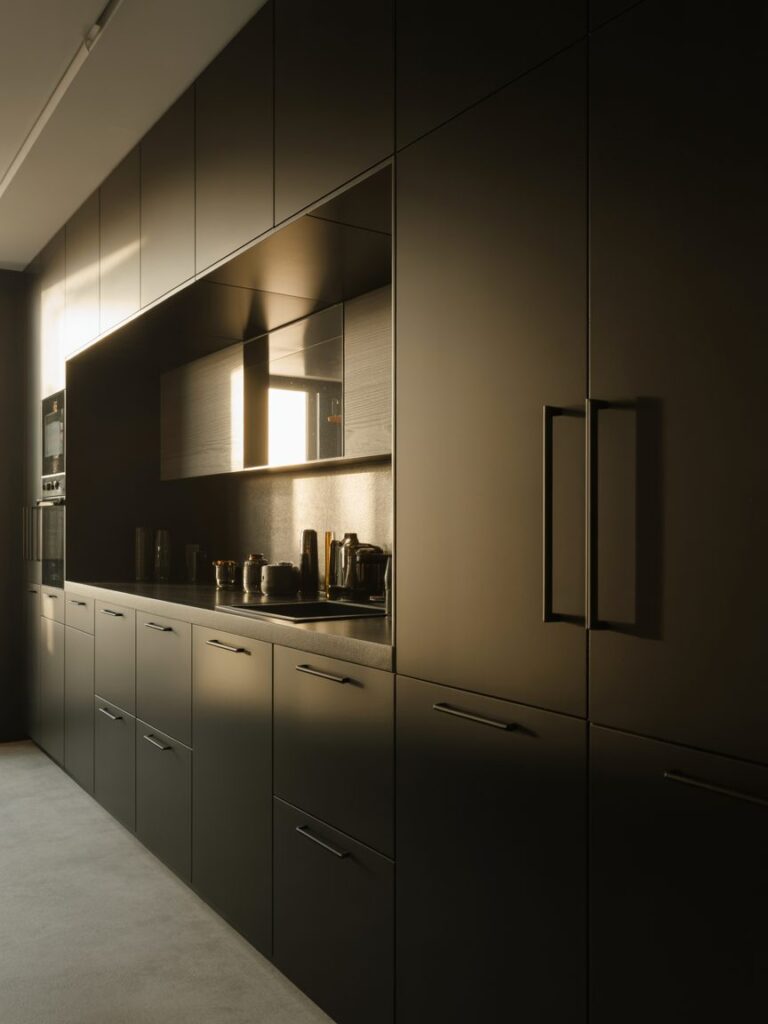 I prefer matte black cabinets because they hide fingerprints better than glossy ones. In real use, this reduces visible smudges by almost 60%. They also absorb light, which gives a soft and smooth finish instead of harsh reflections. This is one of the easiest ways to achieve a clean, premium look.
