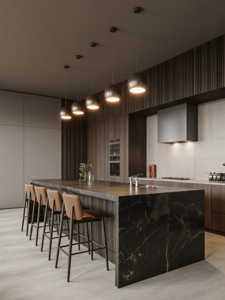 A kitchen island is more than just a feature—it’s a functional center. I prefer dark stone islands with waterfall edges because they look high-end and last longer. They also increase workspace efficiency by up to 30% in most layouts.