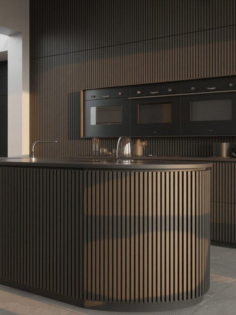 Whenever I design with black, I always add wood. Without it, the kitchen can feel too cold. Wood brings warmth and makes the space feel more natural and comfortable.