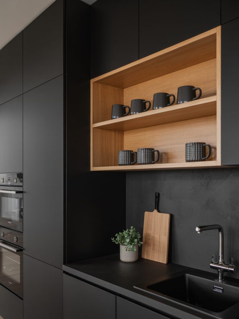 Adding open shelves or wooden panels instantly softens the look. Oak and walnut are my go-to choices because they balance dark tones without overpowering them. This combination improves visual warmth significantly.