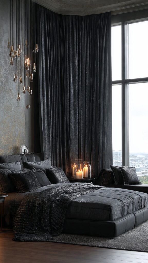 Balance deep curtains with lighter bedding or natural wood accents to keep the space comfortable during the day. Avoid glossy finishes that reflect light and disrupt the soothing tone.