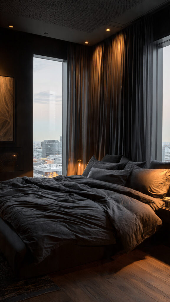 Dark color palettes can actually enhance sleep when designed thoughtfully. Blackout curtains in deeper tones like navy, charcoal, or forest green help absorb light and reinforce a restful mood. Instead of feeling gloomy, the space feels grounded and cohesive. Matching darker curtains with similar wall tones reduces visual contrast and supports a calm nighttime atmosphere. Within Blackout Curtain Bedroom Ideas, this approach is ideal for those who enjoy a wrapped, cocoon-like bedroom environment.