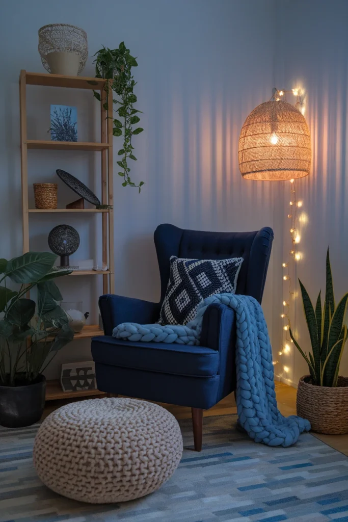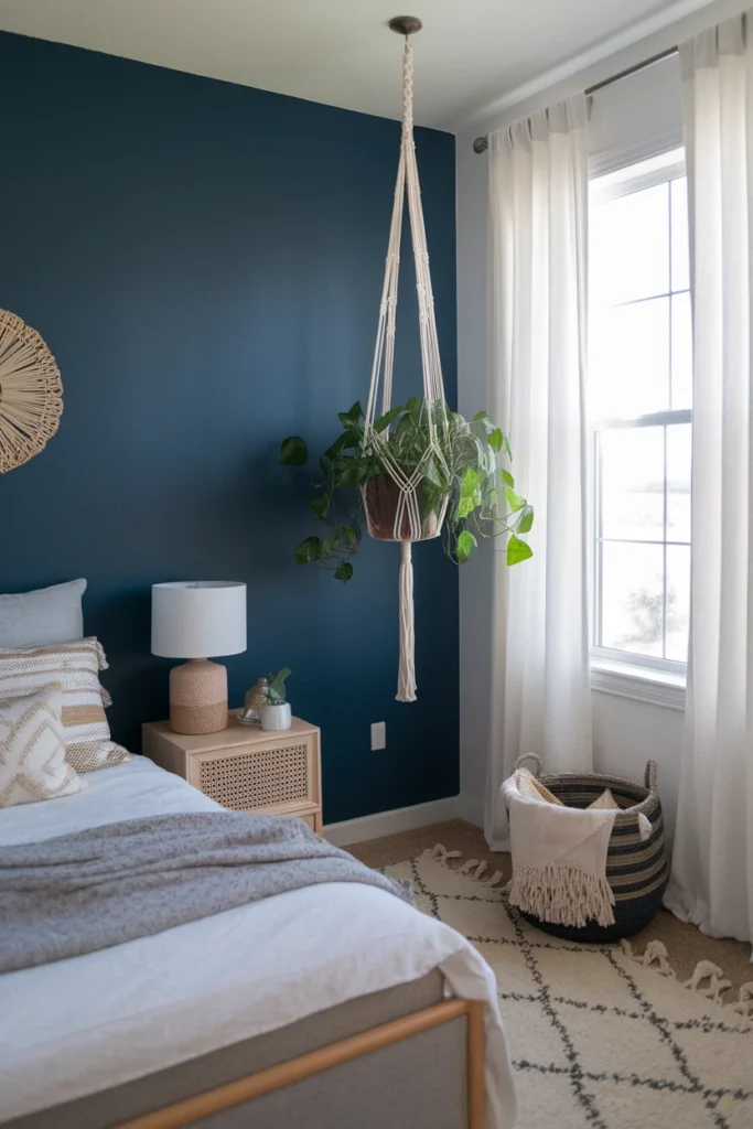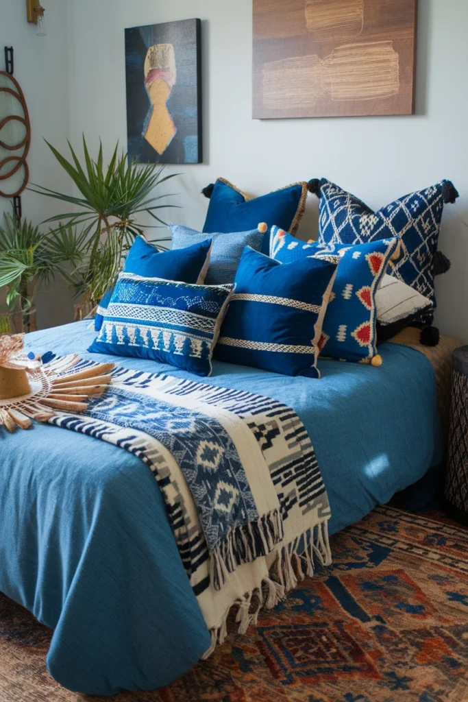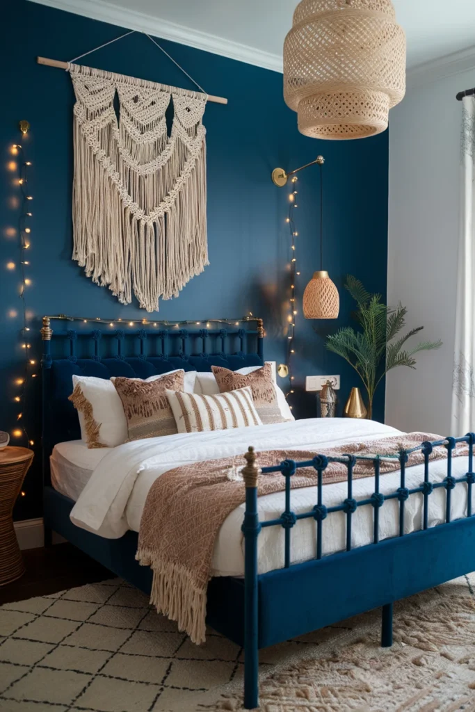 I have experienced that deep indigo tones with velvet textures create a rich yet cozy style. Adding macramé decor and warm lighting keeps the boho feel balanced. Small gold or brass accents complete the elegant look.