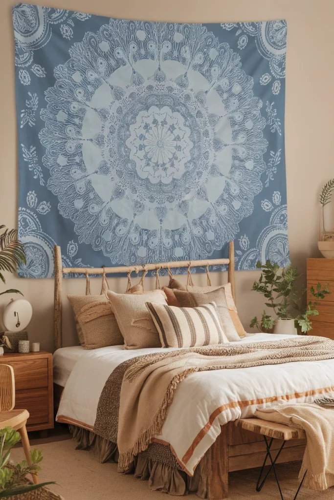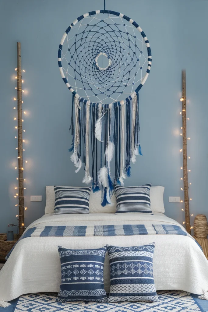 I have used a large blue dreamcatcher above the bed as a focal point, and it instantly adds a boho touch. Pairing it with lights or other hanging decor creates a layered and cozy feel. Smaller pieces around the room help keep the theme consistent.