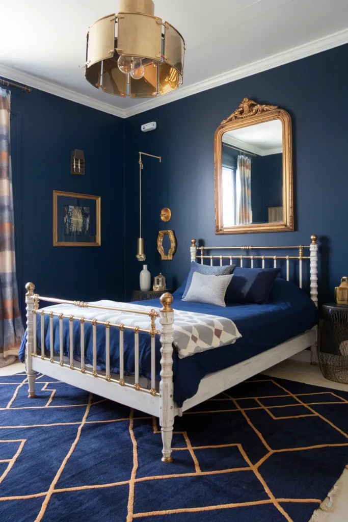 I have paired navy blue with gold accents, and it gives a rich and elegant feel. Small metallic decor pieces and mirrors enhance the overall look. This mix feels both stylish and balanced.