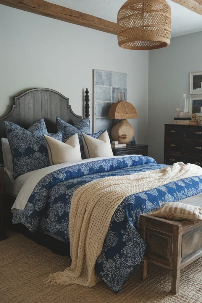 I have combined dark wood furniture with navy bedding to create a warm and stylish look. Light-colored pillows and soft blankets help balance the darker tones. Small vintage touches add character.