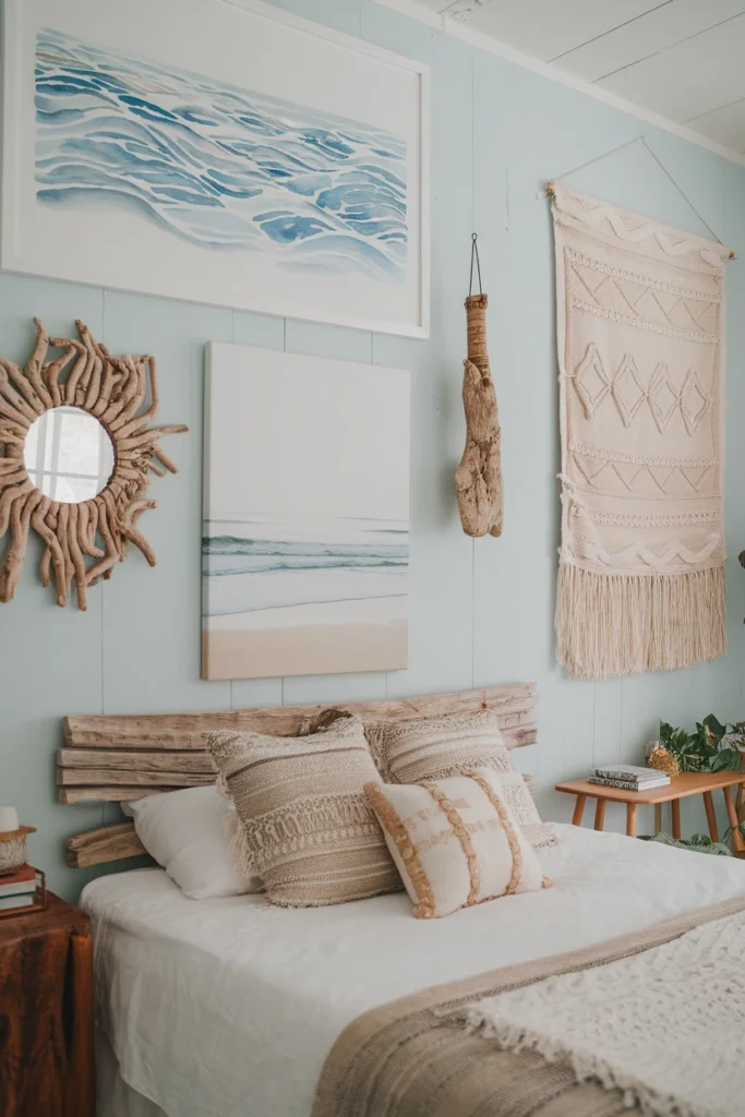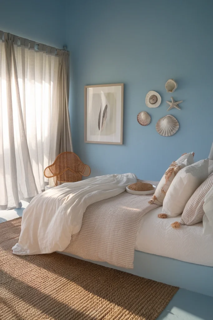 I have created this look by using soft blue walls with white or beige bedding to make the room feel fresh and airy. Adding jute rugs and small coastal decor like shells or beach-inspired accents brings a relaxed seaside vibe. Light curtains help natural light flow in, making the space feel open and calm.