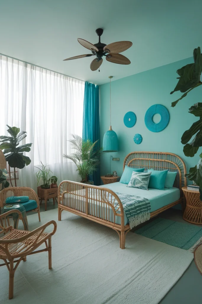 I have mixed turquoise tones with indoor plants to create a fresh and lively atmosphere. Natural materials like wicker or rattan make the space feel more relaxed. Light curtains keep the room bright and airy.