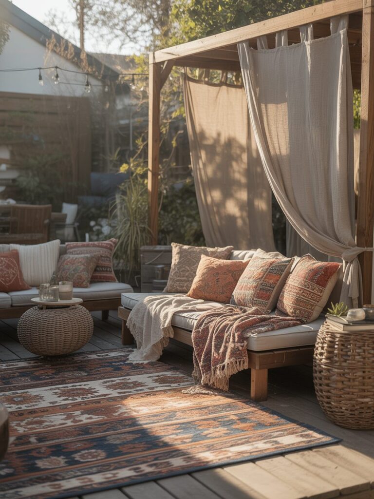 Textiles play a huge role in bringing warmth and personality into a patio design. Even in small spaces, adding layers of fabric can completely change the feel of the area. Boho Garden Patio Ideas often rely on mixing different patterns and textures to create that soft and inviting look.