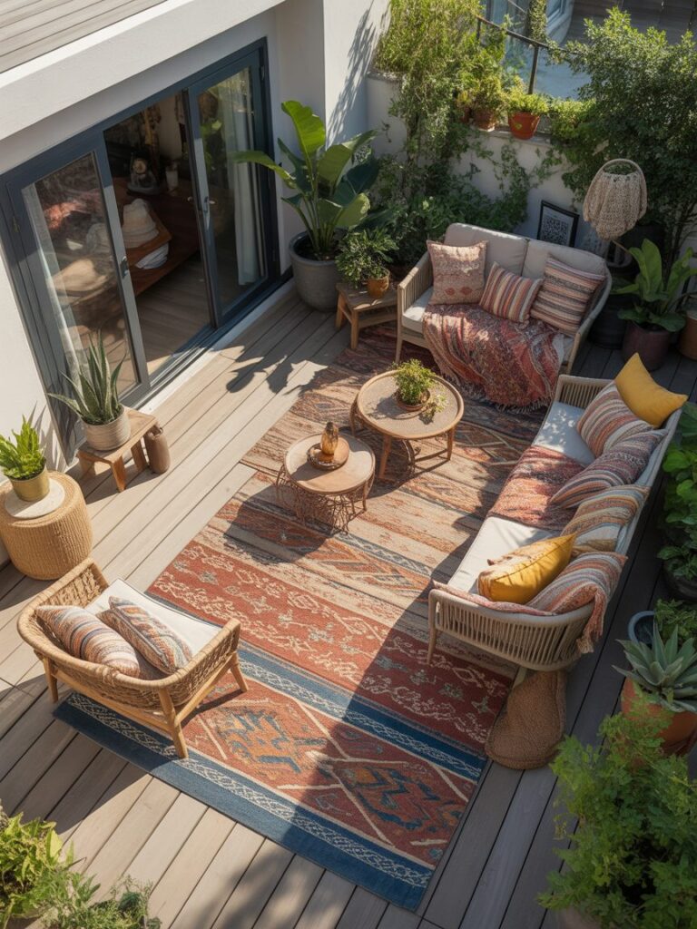 Defining different areas in a small patio can make the space feel more organized and less cluttered. Flooring elements like rugs and mats help create structure without adding bulk. In Boho Garden Patio Ideas, this technique is often used to make compact spaces feel more functional and thoughtfully designed.