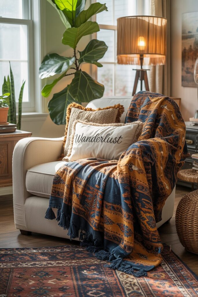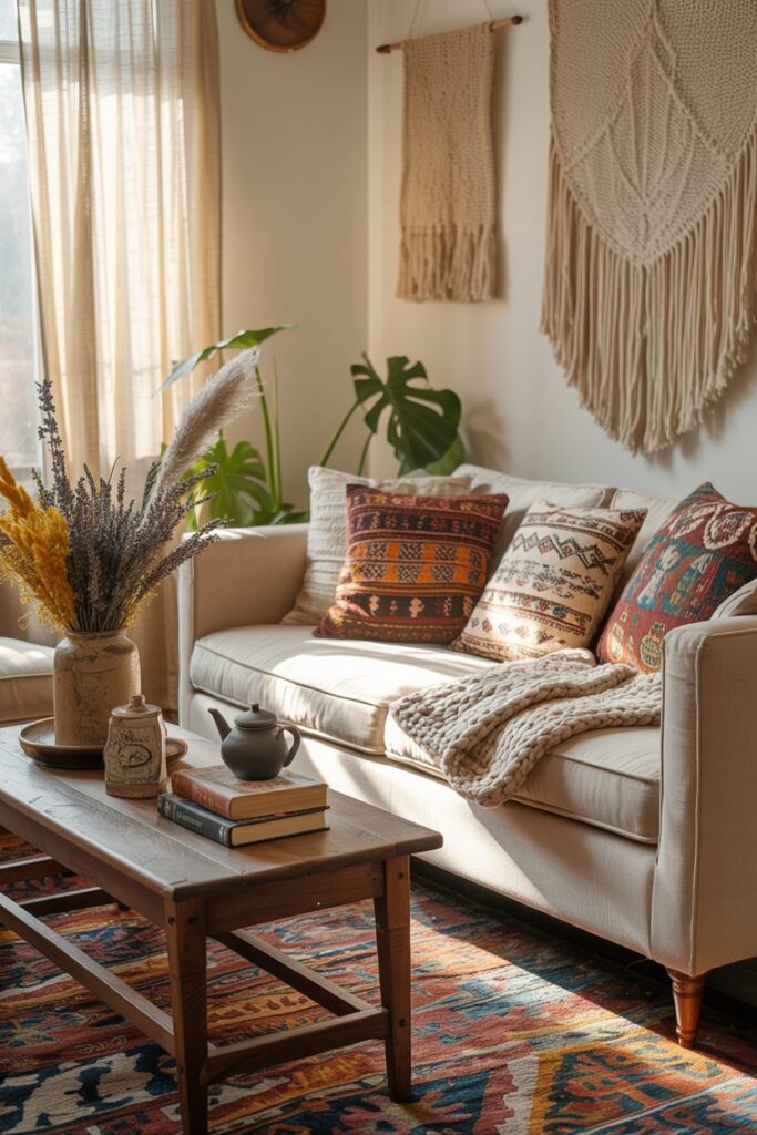 Textiles are one of the most exciting parts of decorating with Boho Living Room Ideas. Fabrics allow you to introduce pattern, color, and personality without making permanent changes to the room. Layering different materials instantly creates a cozy and lived-in atmosphere that defines the bohemian style.