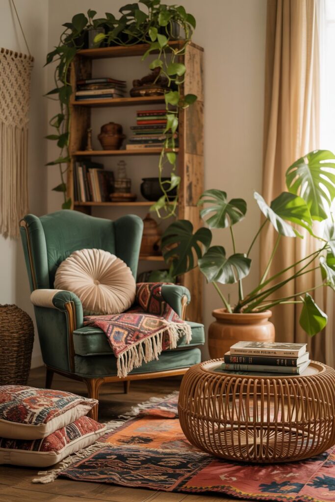 A typical boho living room includes several distinctive elements that work together to create a relaxed environment. Textures are layered throughout the space using materials such as woven rugs, macramé wall hangings, and plush cushions. Patterns are also mixed freely, often featuring global designs like tribal prints, ikat patterns, or traditional textiles. Color palettes usually combine earthy tones with rich accent colors like terracotta, mustard, or deep green. Decorative pieces often include handmade crafts, vintage objects, or souvenirs from different cultures. Finally, greenery plays an important role, as plants bring natural life and softness into the room.