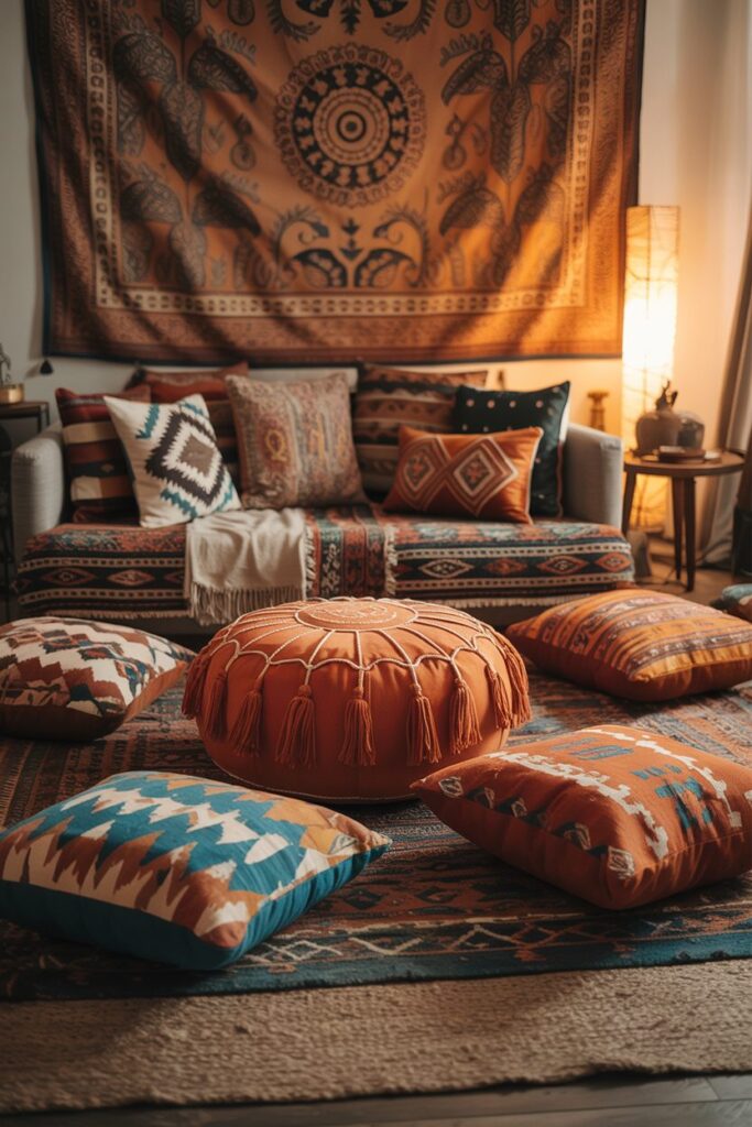 For social gatherings, a conversation area can be created by arranging poufs or ottomans around a central table. These smaller sections help the room feel more functional while keeping the relaxed spirit of bohemian design.