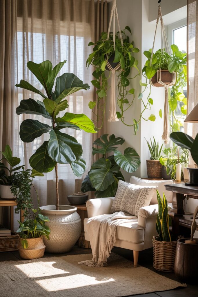 Plants are a defining feature in many Boho Living Room Ideas, and they instantly bring freshness into the space. A bohemian living room often feels like a small indoor garden because greenery softens the design and creates a natural connection with the outdoors.