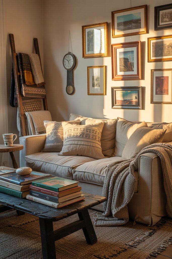 Repurposing older objects is another creative approach. For example, an old wooden ladder can become a blanket rack, or antique boxes can serve as decorative storage. These thoughtful details help transform a living room into a space that feels personal and full of life.