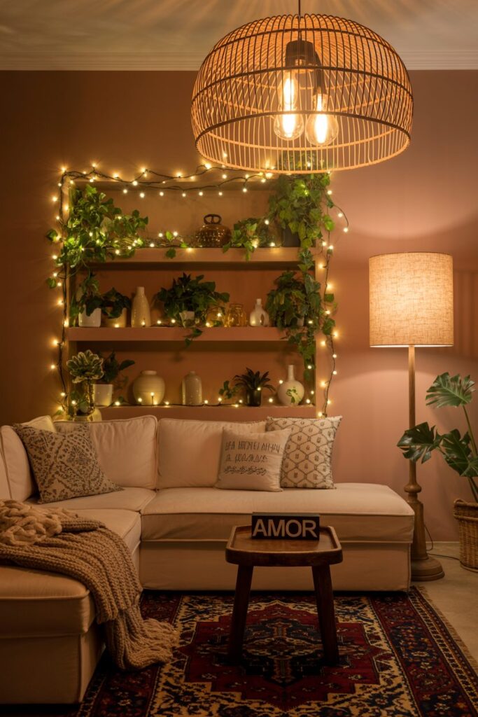 Natural materials such as rattan or woven pendants work beautifully in boho interiors because they add texture while spreading light gently across the room. Floor lamps with warm bulbs can provide comfortable lighting for reading or relaxing. String lights or fairy lights are another popular choice because they create a cozy atmosphere during the evening hours.