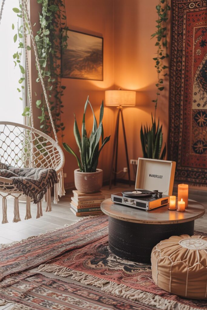 A reading corner might include a comfortable floor cushion or hanging chair along with a small table and soft lighting. Adding a plant nearby can make the space feel calm and inviting. Another area might become a music corner where a record player, candles, and decorative objects create a relaxed atmosphere for listening to music.