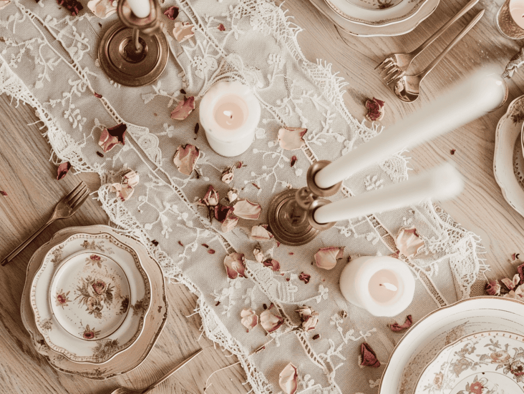 A lace table runner instantly softens a dining space and sets a romantic tone without needing heavy decoration. It pairs beautifully with mismatched plates, ceramic dishes, and vintage-style glassware.