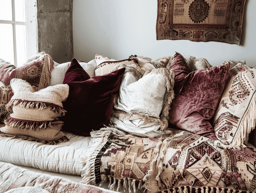 Soft furnishings play a major role in shaping a romantic atmosphere. Velvet pillows in dusty pink, burgundy, and warm cream tones add richness, while fringe and patterned designs keep the look relaxed and bohemian.