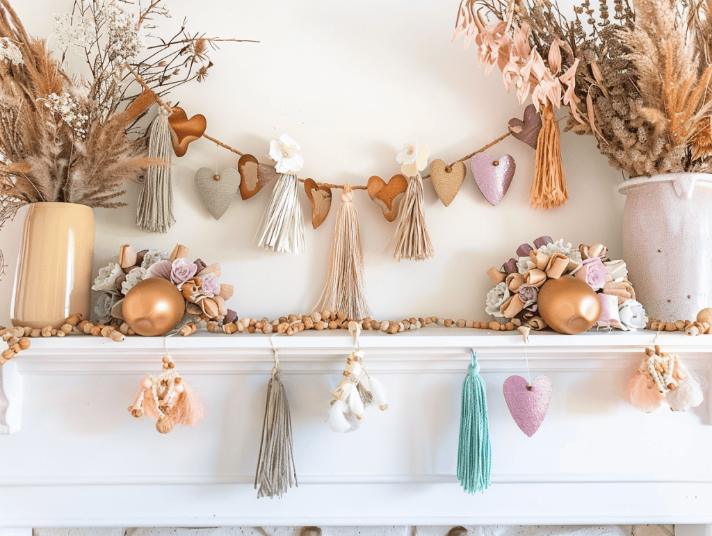 Handmade garlands add creativity and personality to Valentine’s décor. Tassels, wooden beads, and paper hearts in pastel or earthy tones feel playful while still fitting naturally into boho spaces.