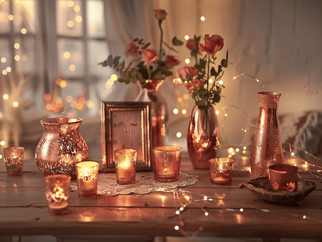 When paired with wood, lace, and neutral textiles, rose gold feels elegant without overpowering the space. Layering these accents with candles or string lights allows them to glow naturally within the décor.