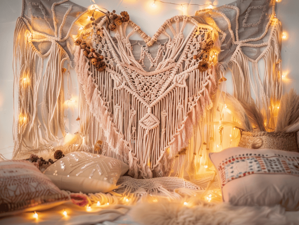 Details like wooden beads, layered knots, and dried flowers give the piece a handcrafted charm. Hanging a macramé heart above the bed, behind a sofa, or within a gallery wall helps anchor the space visually. Adding warm fairy lights around it creates a soft glow that feels especially inviting in the evenings.