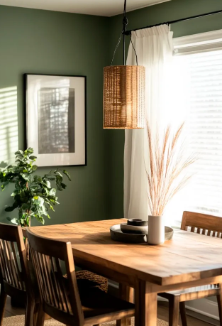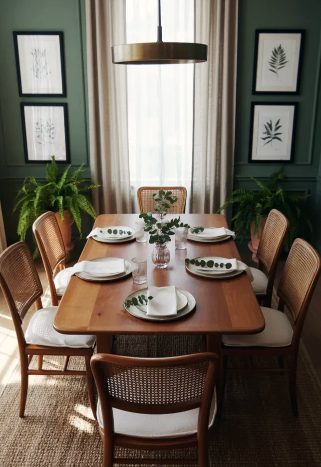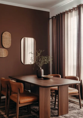 You can fully commit to the color by covering all the walls or create a softer effect with a single accent wall. Adding natural textures like jute rugs, cane chairs, or rattan elements keeps the design balanced and warm. The result is a dining space that feels both dramatic and connected to nature.