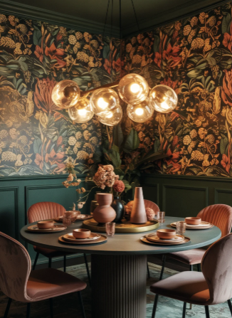 An eclectic approach allows you to design a Bold Moody Dining Room that blends different materials, eras, and design styles. Mixing vintage and contemporary pieces creates visual interest and gives the space personality. Dark tones can connect the different elements, allowing wood, metal, matte surfaces, and glossy finishes to work together in a balanced way.