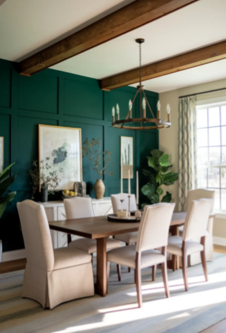 Dark teal introduces a vibrant yet dramatic color option for a Bold Moody Dining Room. This shade adds personality while maintaining the deep and cozy atmosphere that defines moody interiors.