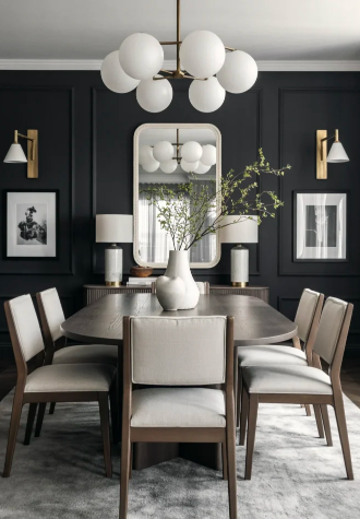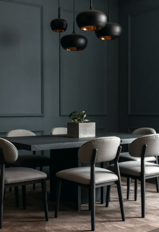 Charcoal and dark gray shades create a modern and polished look for a Bold Moody Dining Room. These colors offer a sophisticated background that pairs well with contemporary furniture and minimal decor. Black metal details, matte finishes, and structured shapes help maintain a sleek and refined atmosphere.